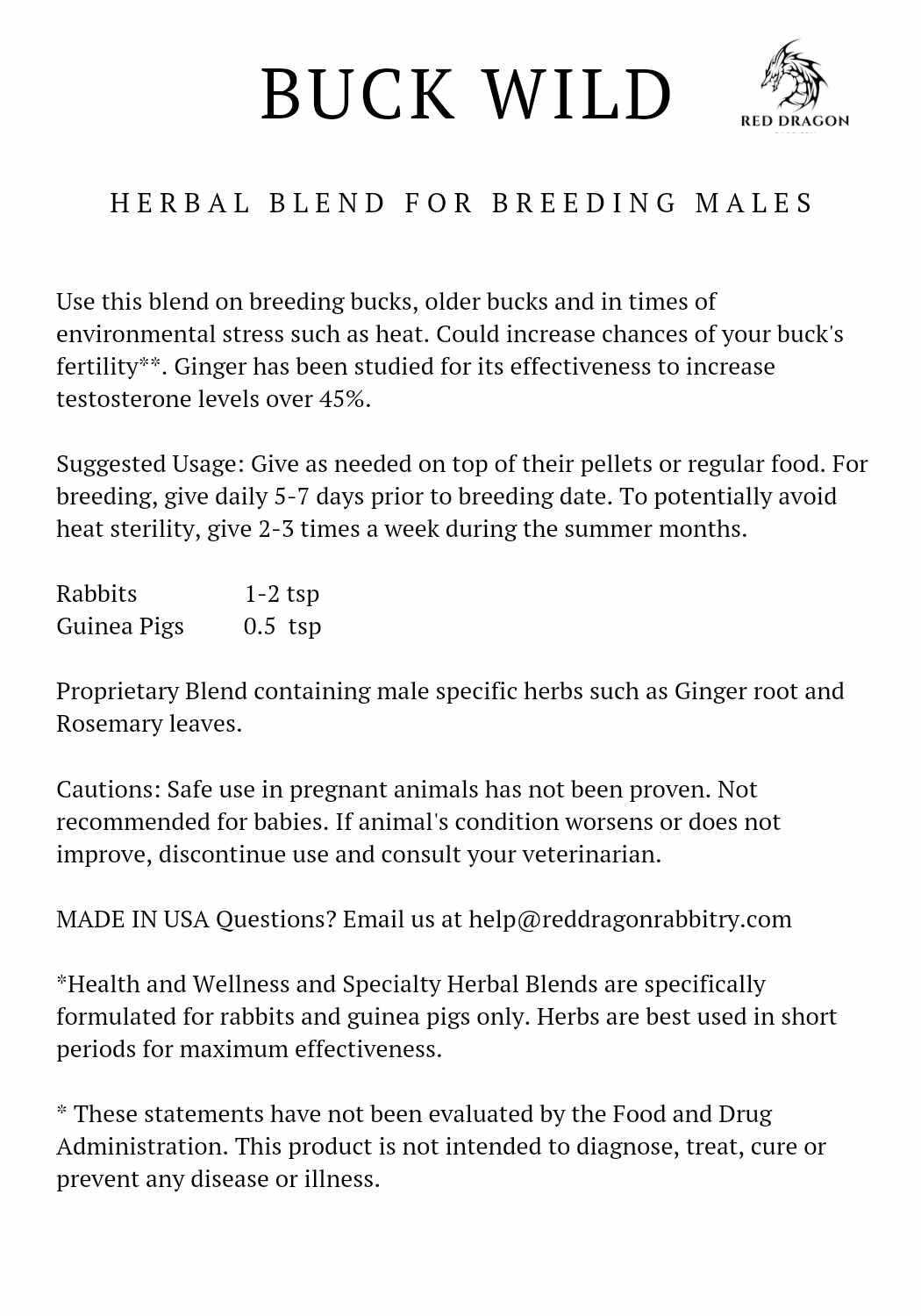 This blend is designed for lazy/stubborn bucks, older bucks, and in times of environmental stress such as heat. Potential to increase bucks fertility. Ginger has been studied for its effectiveness to increase testosterone over 45%.