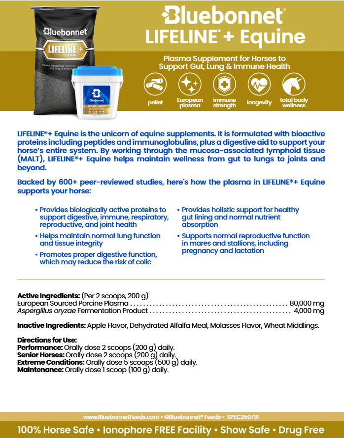 LIFELINE®+ Equine is the unicorn of equine supplements. It is formulated with bioactive proteins including peptides and immunoglobulins, plus a digestive aid to support your horse’s entire system. By working through the mucosa-associated lymphoid tissue (MALT), LIFELINE®+ Equine helps maintain wellness from gut to lungs to joints and beyond.