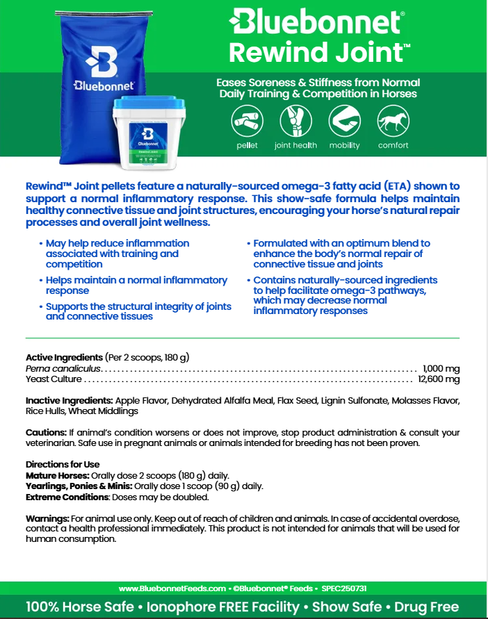 Rewind™ Joint pellets feature a naturally-sourced omega‑3 fatty acid (ETA) shown to support a normal inflammatory response. This show-safe formula helps maintain healthy connective tissue and joint structures, encouraging your horse’s natural repair processes and overall joint wellness.